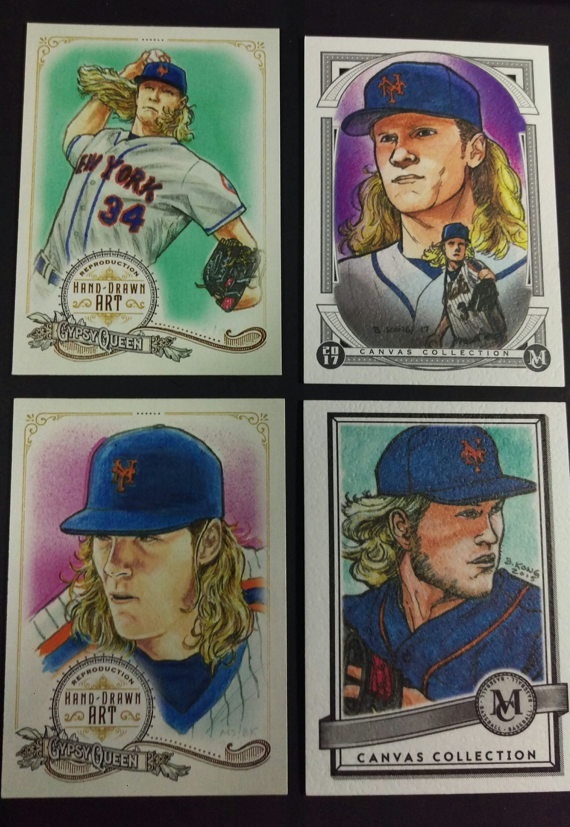 Topps cards featuring Brian Kong artwork of Mets pitcher Noah Syndergaard. 2016 Museum Collection, 2107 Gypsy Queen ( 2 variants ) & 2017 Museum Collection.Brian has been commissioned by the Topps Company since 2007 to illustrate cards for their sports & entertainment products. All four cards come signed by Brian & will be shipped securely in top loaders.