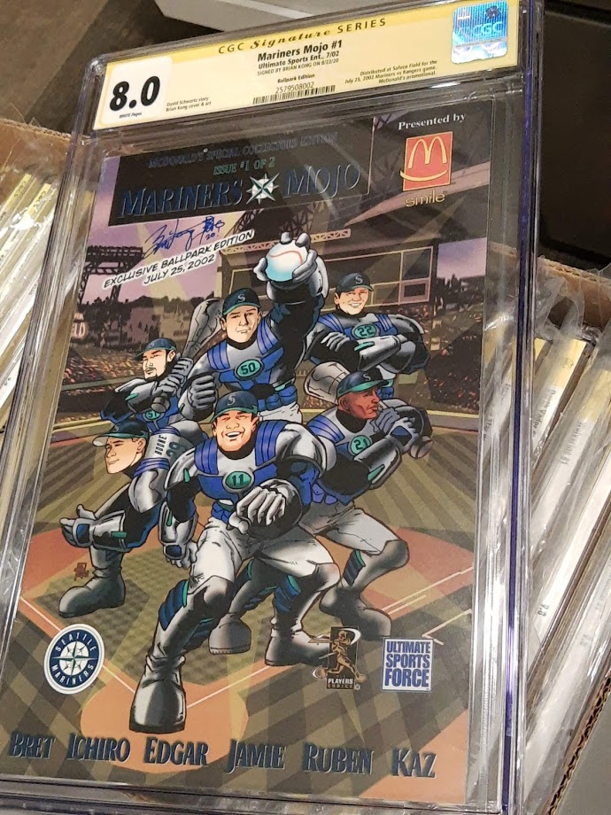 Seattle Mariners comic book giveaway from early 2000s featuring Mariners legends Ichiro, &Edgar Martinez. This rare promo comic is encapsulated cgc Signature Series and comes signed by Brian Kong and is a 8.0.